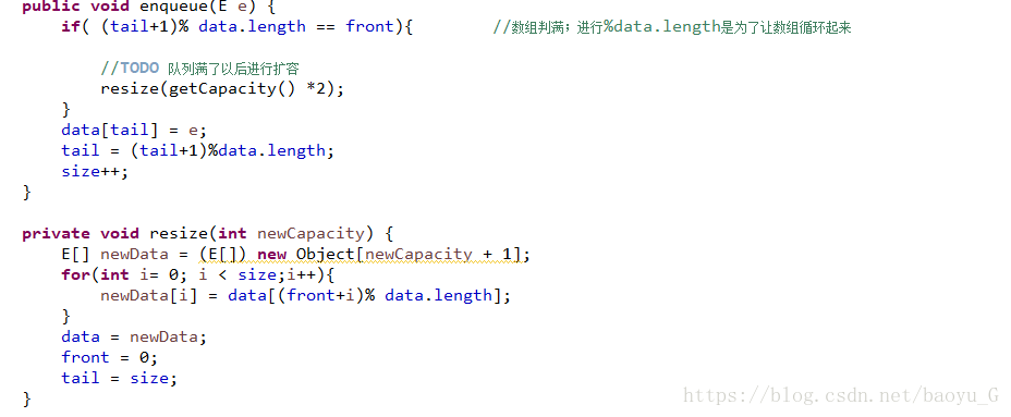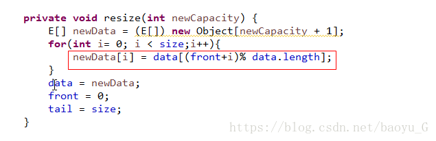 位置都存在front的偏移,所以有了resize()代码中:把data[(front+i)%data.length]赋值给newData[i]