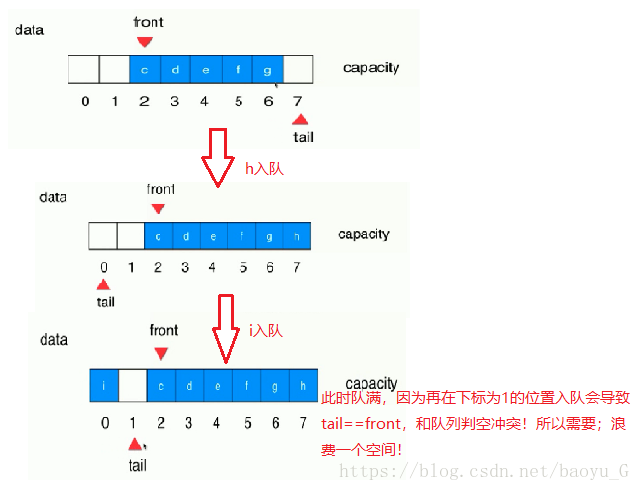 看起来不能再入队,tail不能再进行tail++了,因为tail指示的是队尾的后面第一个空的位置;但是实际上并不是不能再入队,而是可以把数组看成一个环,数组的前面还有空间,tail变为(tail+1)%8=0,tail指示在下标为0的空间!所以tail真正的操作应该是(tail+1)%数组长度;