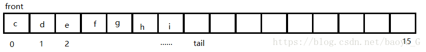 在进行入队时,先根据之前分析的条件,(tail+1)%data.length==front判断是否队满,如果队满进行扩容。扩容的思路是将队列数组的大小调整为原来的2倍,当然也可以是1.5倍,看个人了;当需要扩容时,数组中的元素可能是这样存放的: