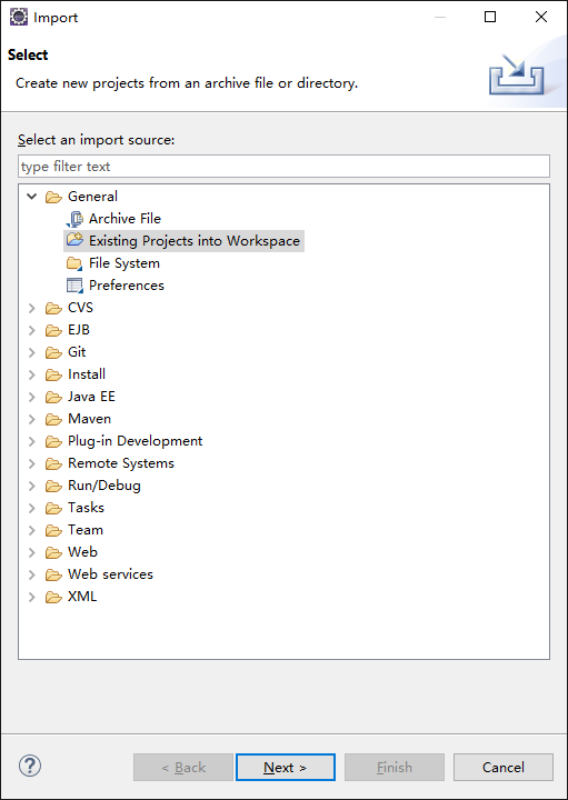 选择General->Existing Projects into Workspace,点“Next”,选“Select root directory”,浏览BlueDemoServer目录,完成导入。