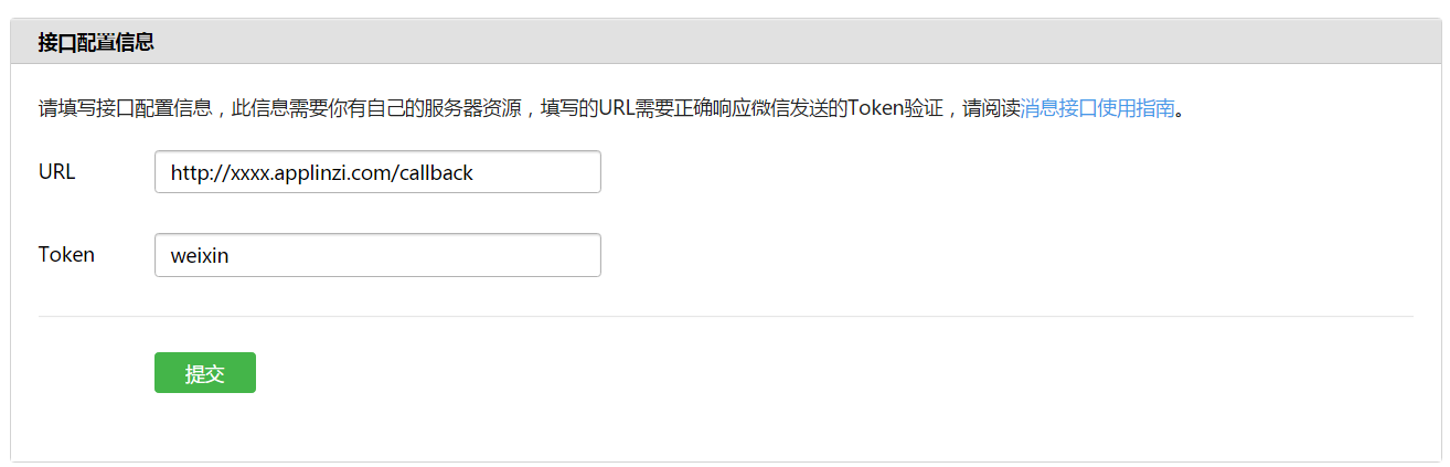 通过网址http://mp.weixin.qq.com/debug/cgi-bin/sandbox?t=sandbox/login登入微信公众平台接口测试帐号,修改“接口配置信息”,在URL填入 http://xxxx.applinzi.com/callback,因为第三方服务器把servlet name配置为callback,所以需加callback后缀,以便微信通过get发送的接入设备凭证能够被后台程序接收到。Token的值就config.properties里token的值相同。配置好后点“提交”就可以了。