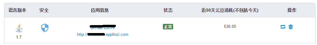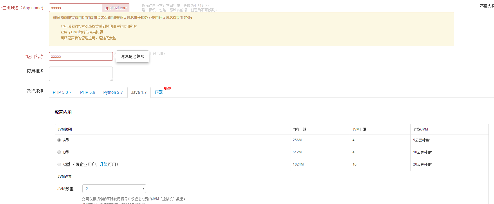 打开http://www.sinacloud.com/sae.html 进入控制台,登陆,点击“创建应用”,进入后,填写二级域名,命字自己取,只要通过就行,然后是应用名,一般会自动生成与二级域名一样,然后,选择Java1.7,这时会提示要有云豆才可以创建,那就用淘宝充个10块钱,也别舍不得,10块有1000个云豆,可以用好久呢,用到调试结束都有剩的。然后在JVM等级里选择最便宜的A型,如下。点创建就可以了。