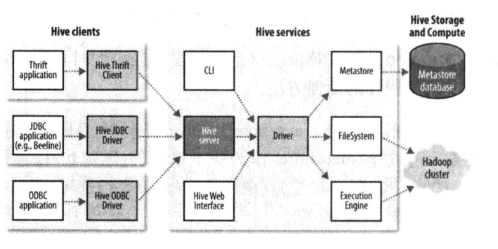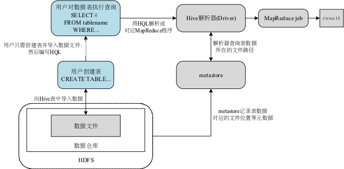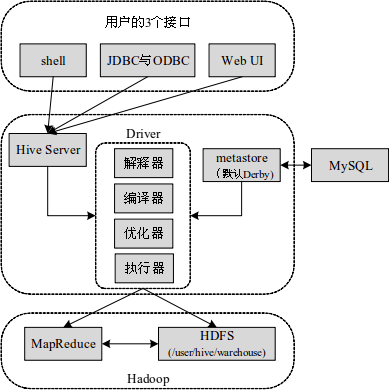 1.Hive是一个构建在Hadoop平台上的用类似SQL的语句HQL来协助读写与管理分布式系统上大数据集的数据仓库框架。可以将结构化的数据文件映射成一张数据库表,将类SQL语句转换为MapReduce任务运行,几行查询语句就能实现一长段MapReduce程序的功能,大大提升了开发效率,使擅长SQL而不熟悉Java和MapReduce、编程较弱的数据分析人员能在HDFS大规模数据集上方便地利用HQL查询、汇总和分析数据。Hive能把SQL中的表和字段转换为HDFS中的目录和文件。Hive本身不存储和计算数据,而完全依赖于HDFS和MapReduce,可理解为一个client将SQL操作转换为相应的MapReduce job在集群上运行。Hive的架构如下所示: