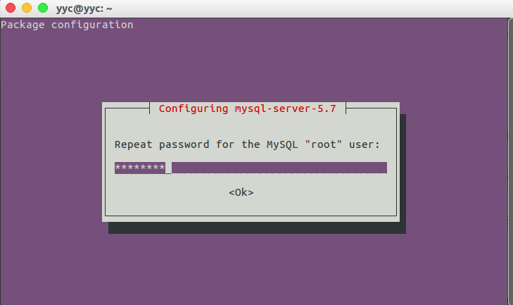 上面的安装会自动包括mysql-client和mysql-common等组件,因此不需要额外再安装。安装过程中命令行终端会出现如下要求设置MySQL的root用户的密码,设置后等待安装完成就好: