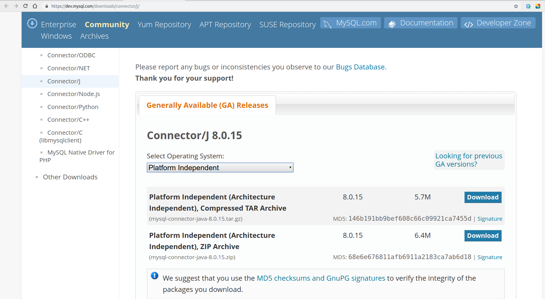 (3)下载MySQL JDBC驱动包备用(地址:https://dev.mysql.com/downloads/connector/j/),后面配置Hive与MySQL相连接时会用到。进入页面后在选择操作系统下拉框中选择“Platform Independent”换为兼容所有操作系统的压缩包下载,如下所示: