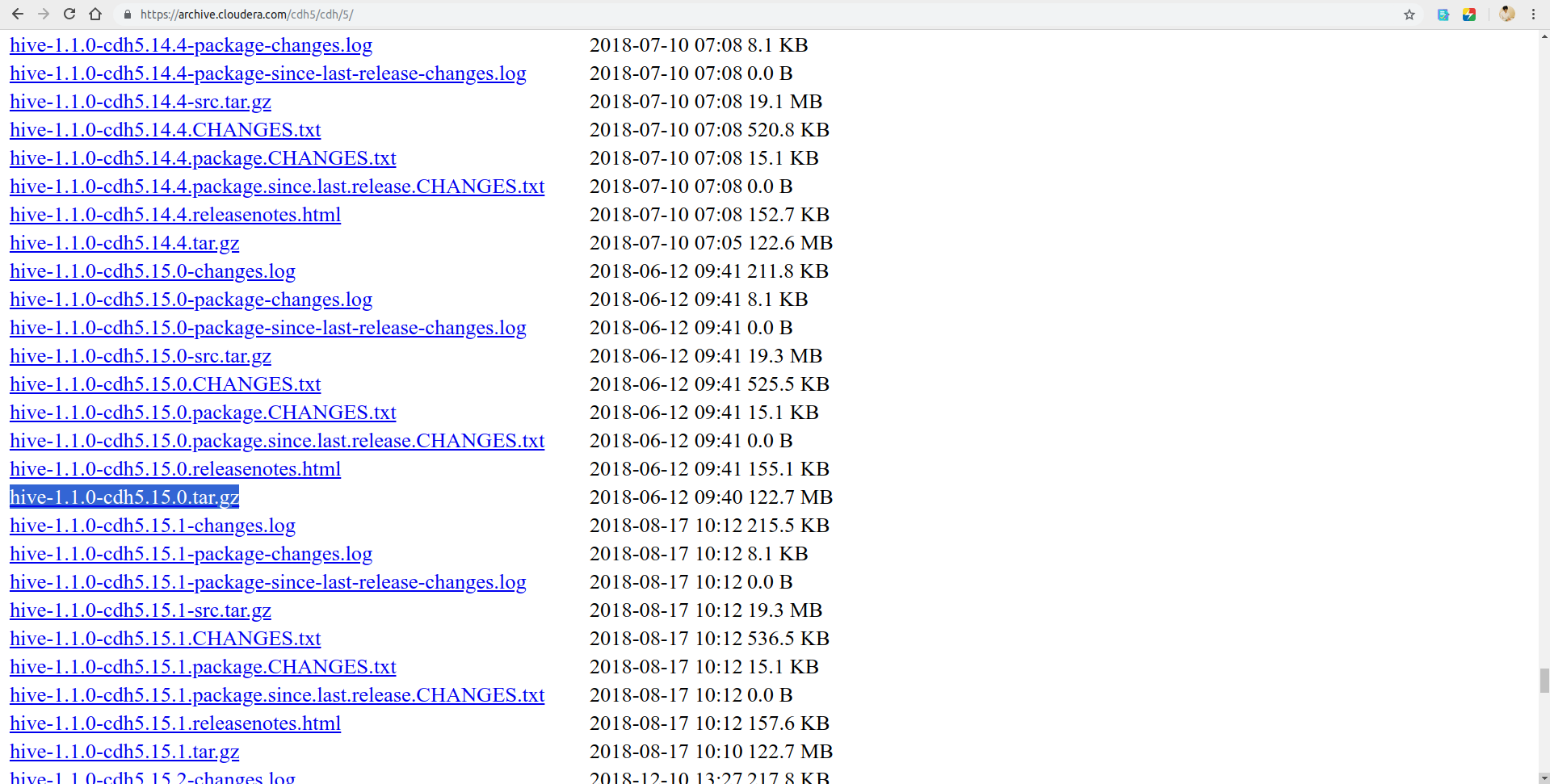 打开网页后可以按ctrl+F查找hive,等页面加载完成后滚动到最后才是各组件的下载地址,注意下载的组件后面有cdh版本,最好与之前下载的hadoop的cdh版本相同,不会出现无法预料的奇怪兼容问题,如下所示: