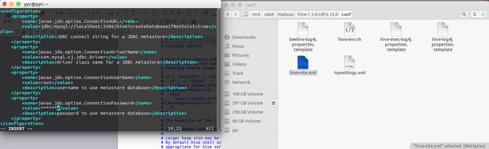 接着,$HIVE_HOME/conf目录中如果有hive-default.xml.template模板就将其重命名为hive-site.xml,再使用vim $HIVE_HOME/conf/hive-site.xml命令编辑该配置文件,如果没有就直接用该命令,会在该目录下创建一个叫hive-site.xml的空配置文件,然后按i进入编辑模式,在该文件中修改或填入以下内容后按ESC退出编辑模式,再按冒号键后输入wq保存并退出: