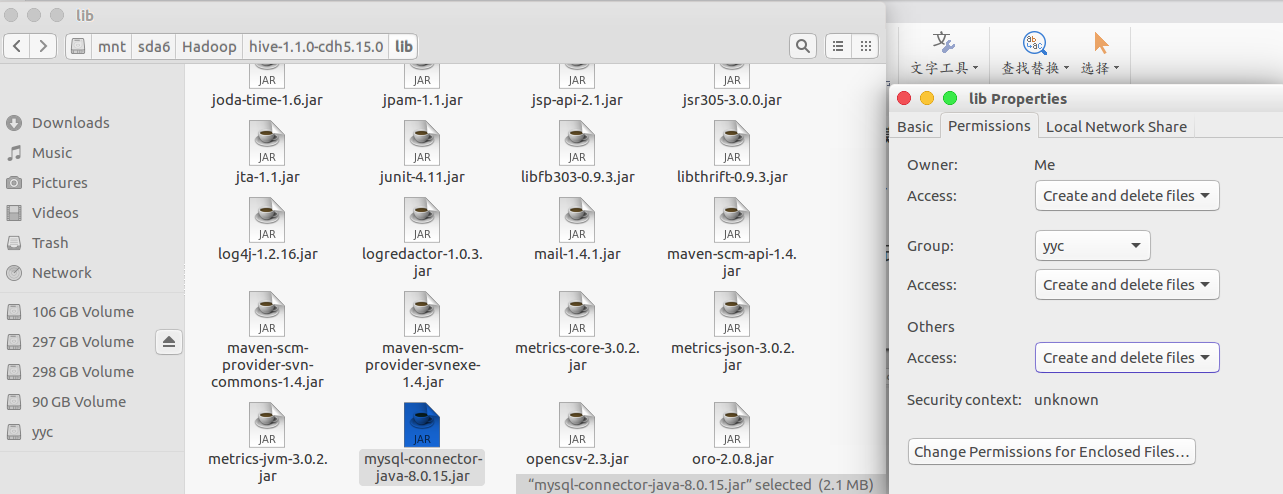 (7)非常重要的一步,一定要记得把先前下载的MySQL JDBC驱动包文件夹中的mysql-connector-java-x.x.x.jar文件复制到$HIVE_HOME/lib目录下,该JAR包是连接MySQL的JDBC驱动,没有它就无法连接MySQL,其中就包含上面配置文件指定的“com.mysql.jdbc.Driver”类。如果不能黏贴过去,可能是lib目录的读写权限问题,可以右键该目录点击属性,然后点击“权限”选项卡修改“组”和“其他人”的权限为可读写,如下所示: