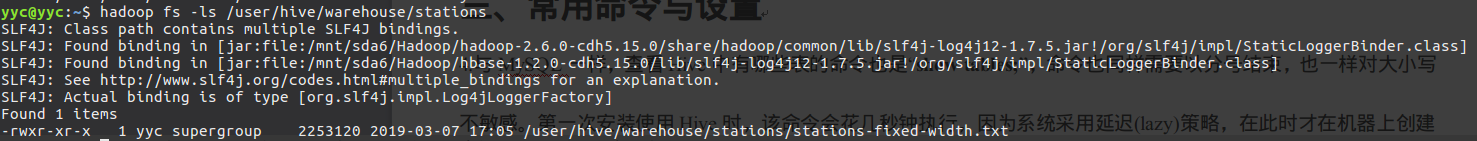 使用hadoop fs -ls命令也可以看到,Hive的启动会在HDFS上建立一个/user/hive/warehouse目录,里面会存放以后Hive新建的表,表名实际上就是一个目录(如stations表),表中导入的数据实际上就是导入的文件本身,如下所示: