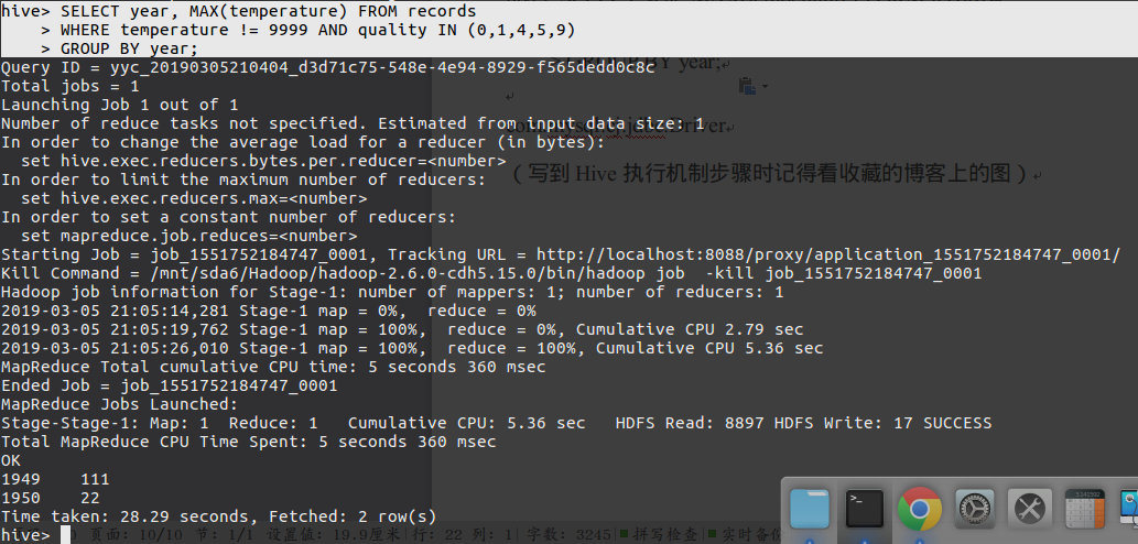 上述查询先利用map脚本将map结果输出到map_output文件中,再利用reduce脚本处理map_output输出每年的温度最大值。