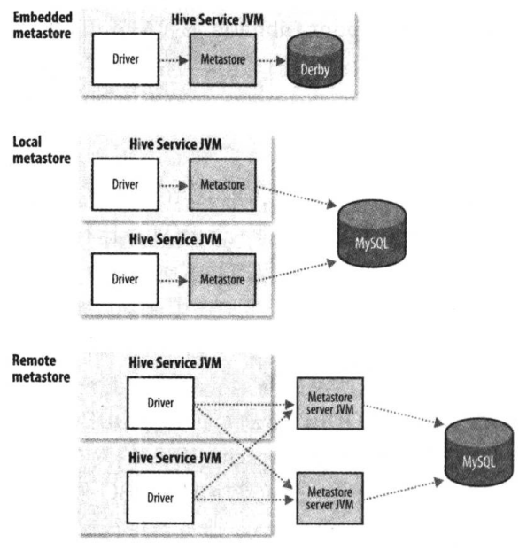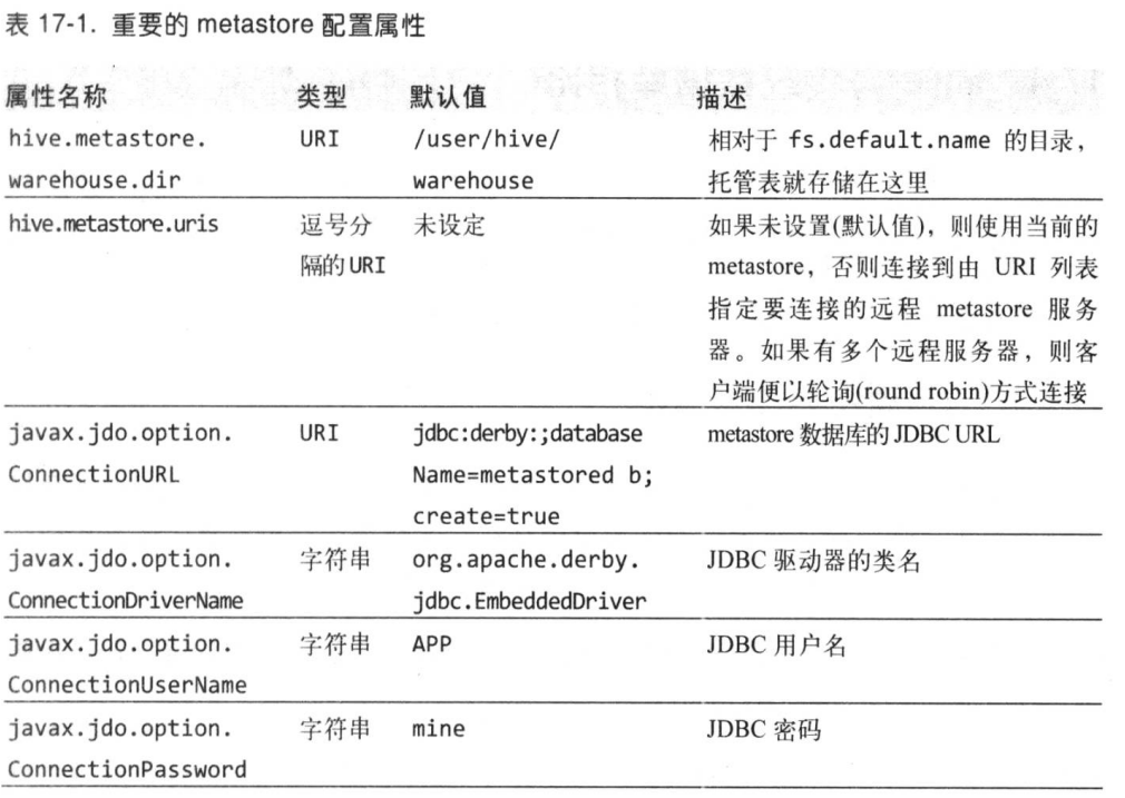 第一个属性指metastore的JDBC URL地址,这里设置为本机上的mysql,并在启动hive时自动查看mysql中是否存在名为“hive”的数据库,若不存在则创建它。第二个属性指定metastore连接到MySQL的JDBC驱动类。第三个属性指连接metastore的用户名,这里就是登录MySQL的用户名。第四个属性是对应用户名的密码,这里也是MySQL上的密码。