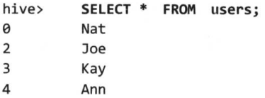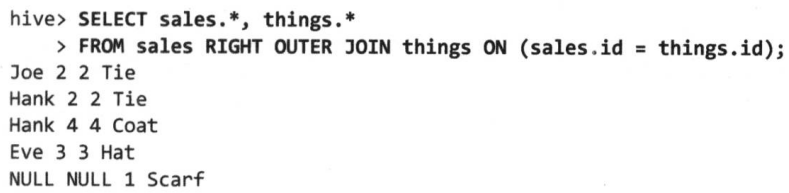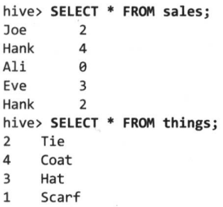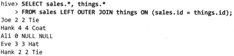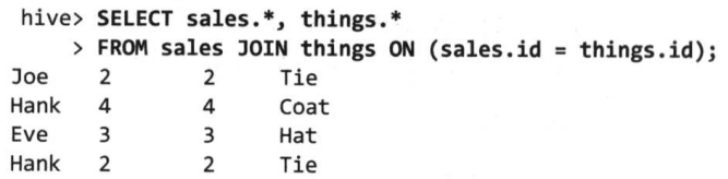 hive> SELECT sales.*, things.* FROM sales, things