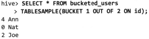 后续的查询可以利用这个在同一文件中已经分好组并降序排好序的年份气温。如果SORT BY和DISTRIBUTE BY中所用的列相同,可以缩写为CLUSTER BY以同时指定两者所用的列。