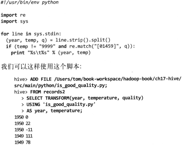 29.与Hadoop Streaming类似,TRANSFORM、MAP和REDUCE子句可以在Hive中调用外部脚本和程序,例如下面的Python脚本和Hive使用该外部脚本的查询例子可以过滤掉质量指数不正常的气温读数行: