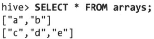 hive> CREATE TABLE arrays (x ARRAY<STRING>)