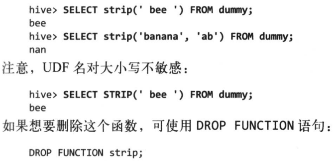 36.有时用户需要的查询无法使用Hive提供的内置函数来表示,用户可以编写自己定义的函数(user-defined function,UDF)使Hive插入用户写的处理代码并在查询时调用它们。UDF必须用Java编写,其他语言可以使用SELECT TRANSFROM...USING语句来使用其他语言的处理脚本。Hive中有三种UDF: