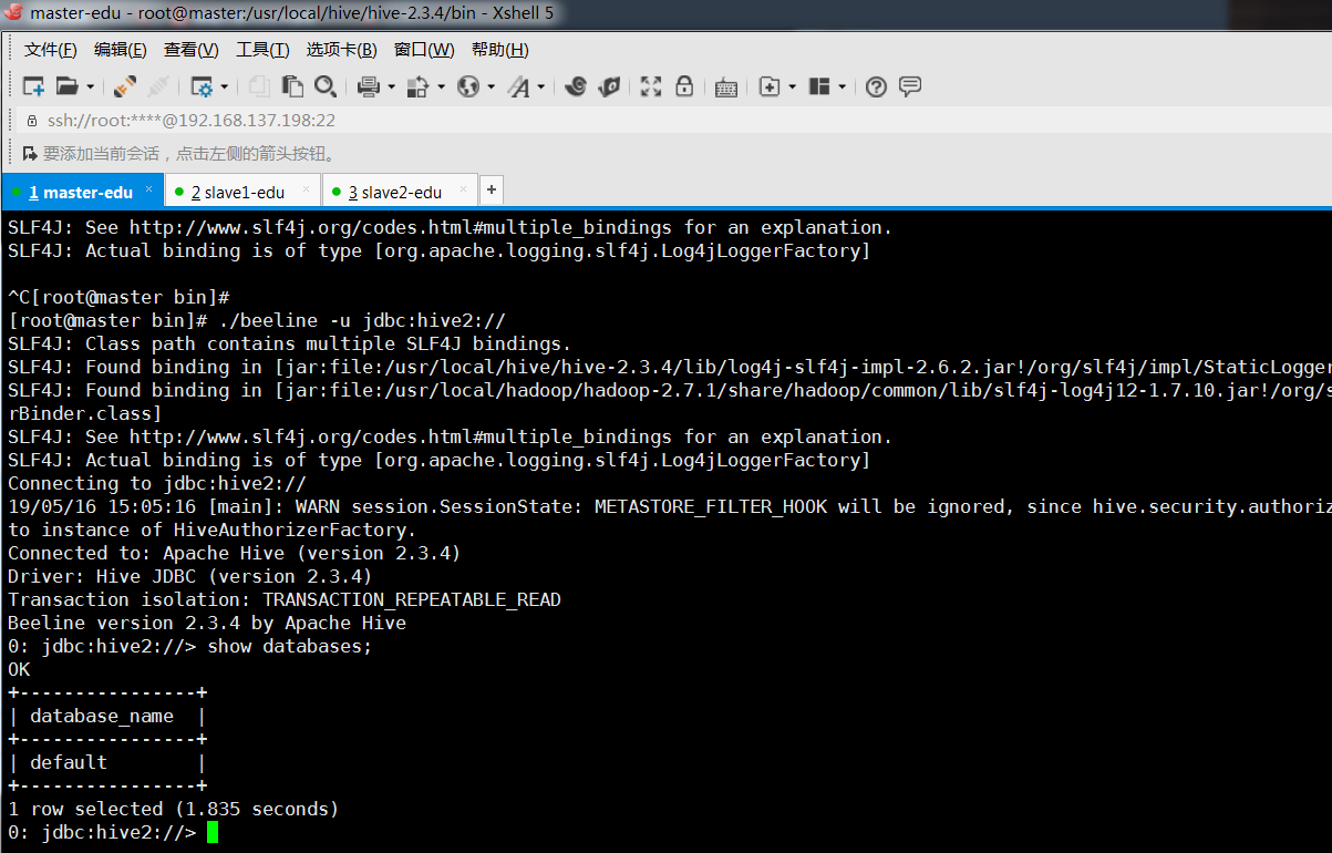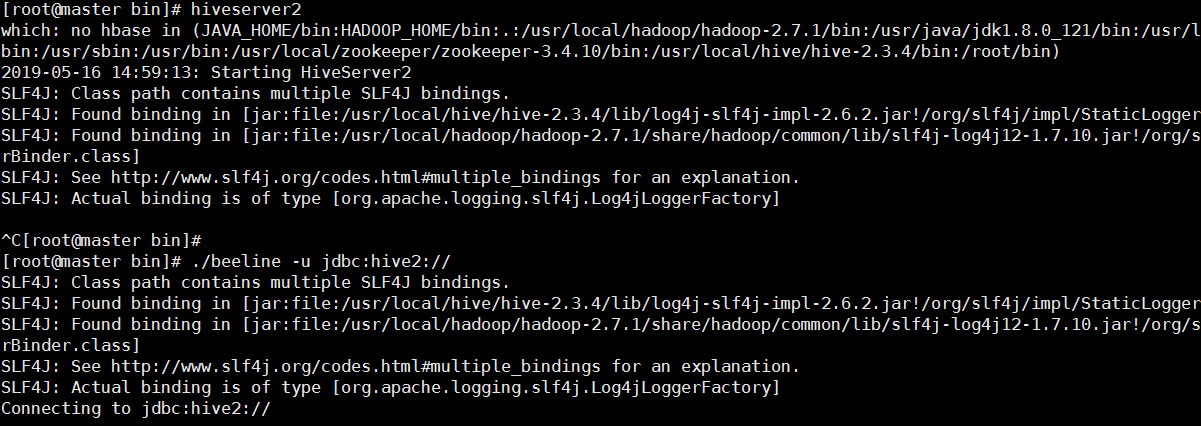 第二种方法(先hiveservice2 , 在执行:./beeline -u jdbc:hive2://):
