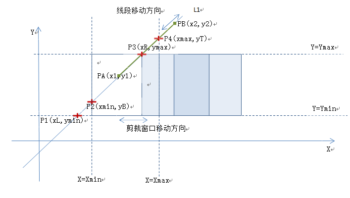 线段的两个端点分别是PA(x1,y1),PB(x2,y2),L1与Y=Ymin的交点P1(xL,ymin),与Y=Ymax的交点P3(xR,ymax)。当线段的一个端点PA滑动到P3之上或PB滑动到P1之下时,无论裁剪窗口怎么滑动都不可能与PAPB存在公共部分。