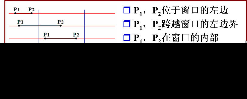 消除指定区域内或区域外的图形部分的过程称为裁剪。在一维裁剪窗口中<1>,线段与裁剪窗口的关系如下图所示