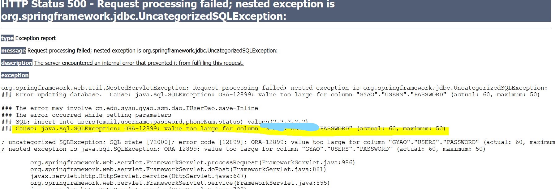 以上就是贪玩火最近收集整理的关于SSM用户管理报错:Cause:java.sql.SQLException:ORA-12899:value too large for column****."PASSWORD"的全部内容,更多相关SSM用户管理报错:Cause:java.sql.SQLException:ORA-12899:value内容请搜索靠谱客的其他文章。