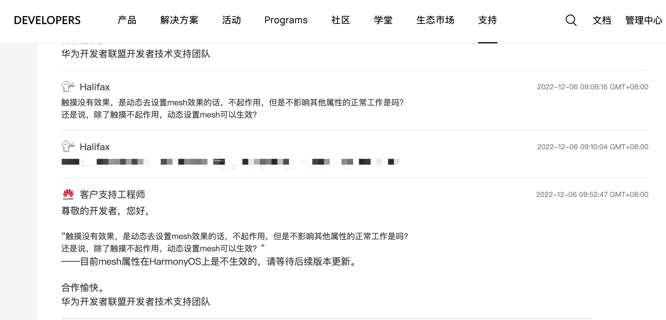那么ArkUI中如何实现这个这种效果呢?HarmonyOS文档里面Shape组件有个Mesh属性,按理说它可以实现这种效果,我就提了个工单,询问关于Mesh属性的问题,官方给我的回复是: