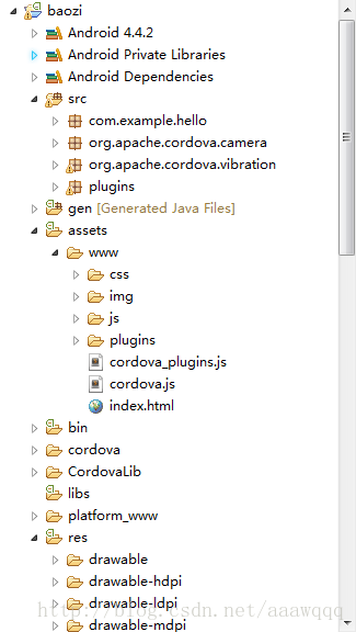 plugins : 文件夹 存放的是phonegap插件 以后 文件,摄像头等插件都下载到这里,在下篇文章中介绍用法