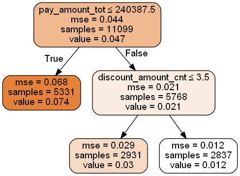 dtree = tree.DecisionTreeRegressor(max_depth = 2,min_samples_leaf = 500,min_samples_split = 5000)