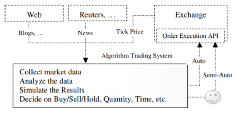 专门的算法交易系统中通常有几个标准模块,包括交易策略、指令执行、现金管理和风险管理。交易策略是自动交易系统的核心,通过复杂的算法来分析数据(价格数据、公司财务数据和其它非标准数据如新闻、卫星图像、微博等新媒体),捕捉市场中的异常情况,并利用这些信息发现盈利模式,或发现竞争对手的策略。交易策略中使用了各种技术从数据中提取可操作的信息,包括规则、模糊规则、统计方法、时间序列分析、机器学习以及文本挖掘等。
