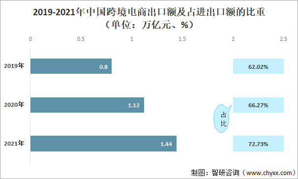 2019-2021年中国跨境电商出口额及占进出口额的比重