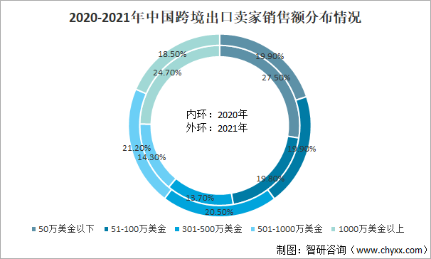 2020-2021年中国跨境出口卖家销售额分布情况