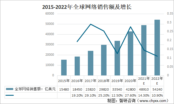 2015-2022年全球网络销售额及增长