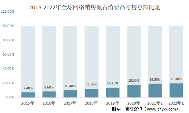 从市场份额来看,2020年全球网络销售额占消费品零售总额的18%,这一市场份额将进一步扩大,预计至2022年全球网络销售额占消费品零售总额的比重将超过20%,达到20.4%。