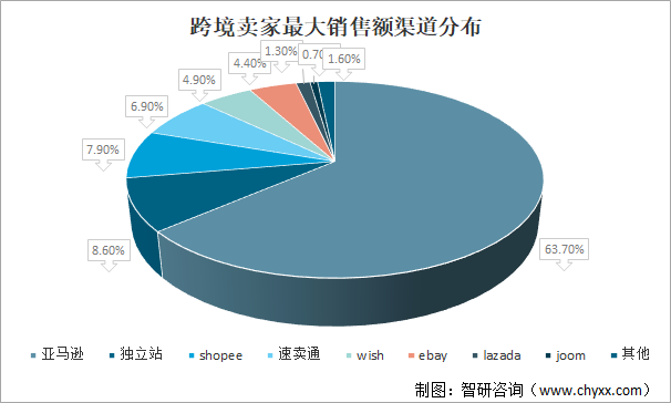从全球跨境卖家最大销售额渠道分布来看,其中亚马逊占比最大,占63.7%;独立站占8.6%;shopee占7.9%;速卖通占6.9%;wish占4.9%;ebay占4.4%;lazada占1.3%;joom占0.7%;其他占1.6%。