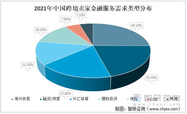 跨境电商业务是中国外贸的强劲增长点,跨境电商企业对金融服务需求逐渐增强,2021年中国跨境卖家海外收款占39.1%;融资/贷款占32.4%;外汇结算占27.8%;理财投资占21.5%;保险占20.3%;COD占7.8%;其他占7.1%。