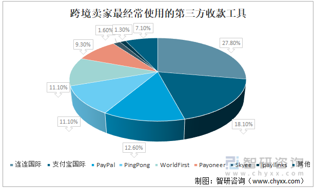 跨境电商金融服务业务是国际业务的重要组成部分,跨境卖家最经常使用的第三方收款工具主要由连连国际、支付宝国际、PayPal、PingPong、WorldFirst、Payoneer、Skyee、Ipayllinks,分别占27.8%、18.1%、12.6%、11.1%、11.1%、9.3%、1.6%、1.3%。
