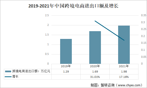 2019-2021年中国跨境电商进出口额及增长