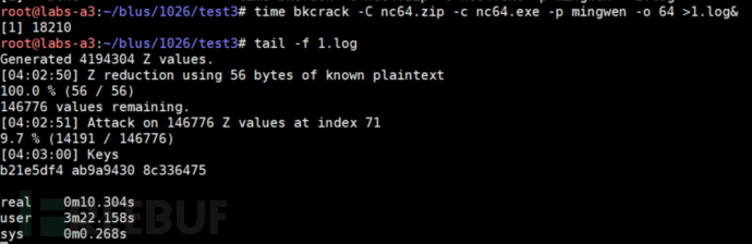 time bkcrack -C nc64.zip -c nc64.exe -p mingwen -o64 >1.log&#查看进度