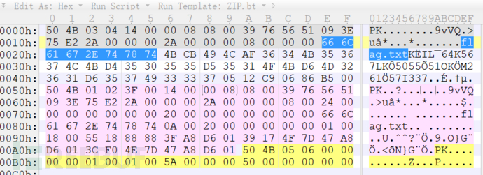 将一个名为flag.txt的文件打包成ZIP压缩包后,你会发现文件名称会出现在压缩包文件头中,且偏移固定为30。且默认情况下,flag.zip也会作为该压缩包的名称。