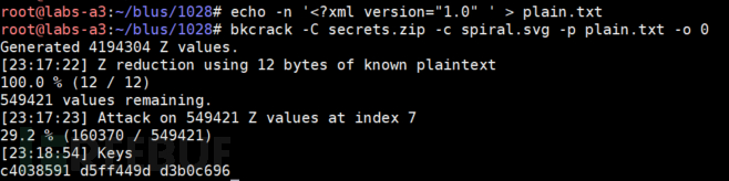 echo -n '<?xml version="1.0" ' > plain.txtbkcrack -C secrets.zip -c spiral.svg -p plain.txt -o 0