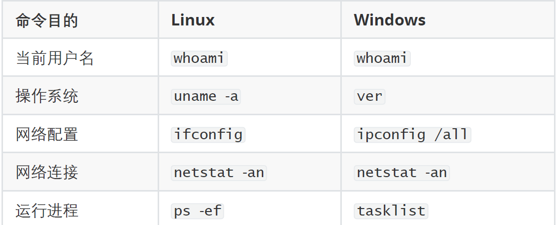 当您确定了OS命令注入漏洞后,通常可以执行一些初始命令来获取有关受到破坏的系统的信息。以下是在Linux和Windows平台上有用的一些命令的摘要: