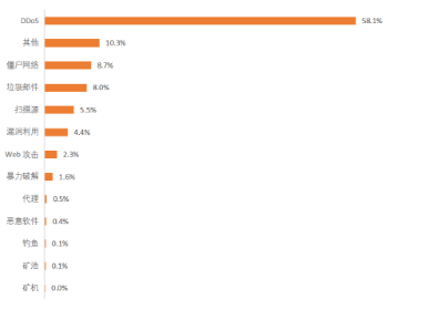 图 3.33 DDoS 惯犯异常行为类型占比 数据来源:绿盟科技威胁情报中心(NTI )