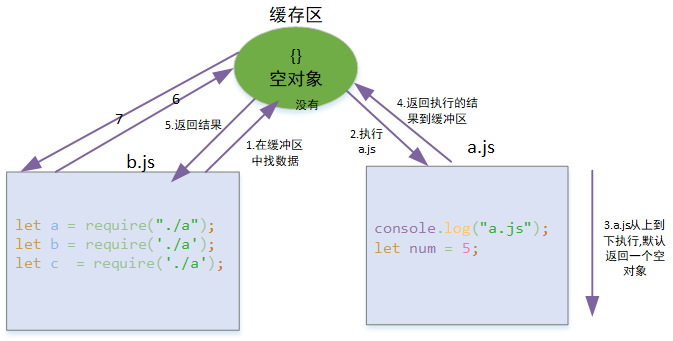 而且我们可以看到a.js只被打印了一次,说明虽然我们多次的引入了a.js,但是a.js只执行了一次.后面会直接在缓存区找数据,不会再次执行a.js.