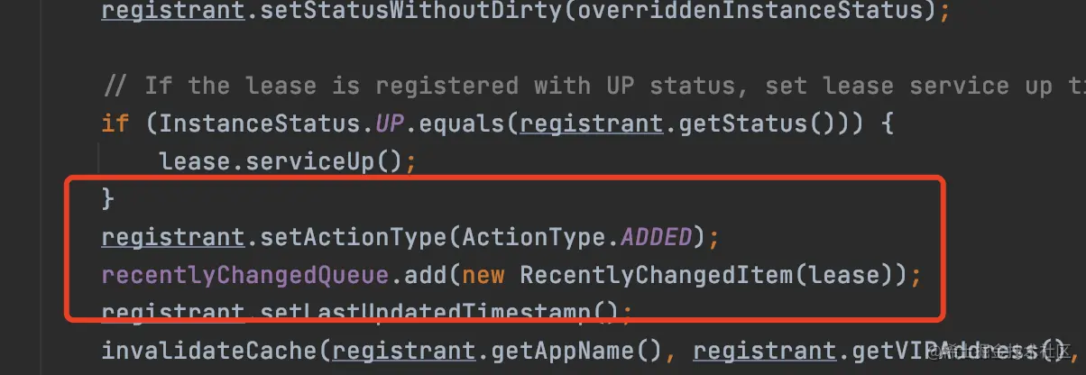 所以服务注册这个操作就会有两步操作,首先会往注册表中添加这个实例的信息,其次会给这个实例标记为新添加的,然后封装到RecentlyChangedItem中,存到recentlyChangedQueue中。