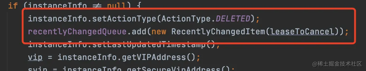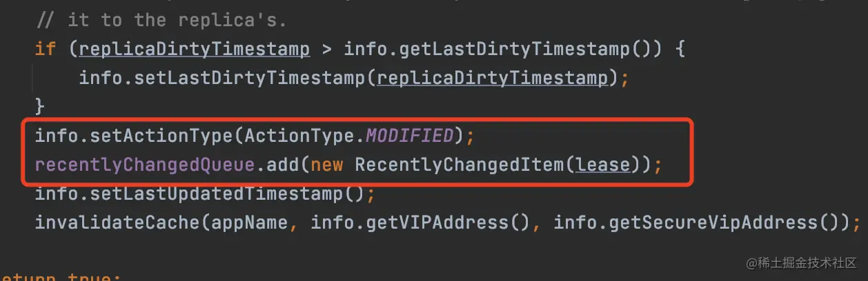 同样的,服务实例状态的修改、删除(服务实例下线)不仅会操作注册表,同样也会进行标记,封装成一个RecentlyChangedItem并添加到recentlyChangedQueue中。