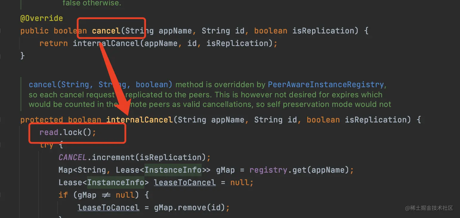 服务下线就是在注册表删除这个服务实例的信息,服务下线的方法最后是调用internalCancel实现的,而internalCancel是加的读锁,所以服务实例下线的时候加了读锁。
