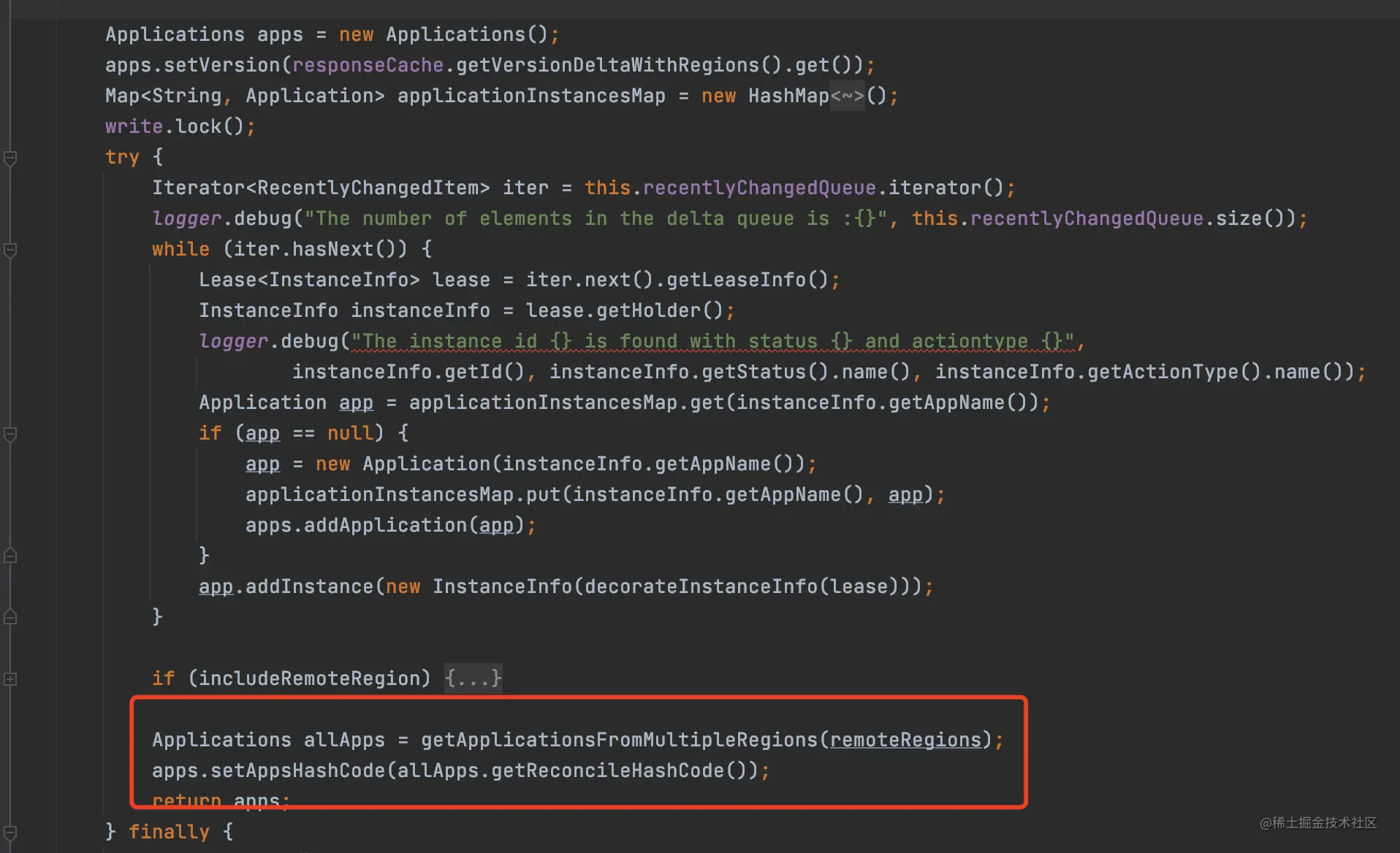 所谓的增量信息,就是返回最近有变动的服务实例,而recentlyChangedQueue刚刚好保存了最近的服务实例的信息,所以这个方法的实现就是遍历recentlyChangedQueue,取出最近有变动的实例,返回。所以保存最近变动的实例,其实是为了增量拉取做准备的。
