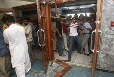 | 愤怒的股民砸毁了股票交易所和附近银行的门窗 |