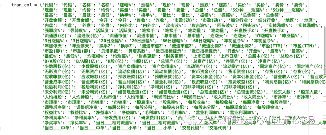 由于内容比较多,可以事先用dict(zip(xx.columns, xx.columns)语句打印出来,经过筛选作为tran_col字典的内容。