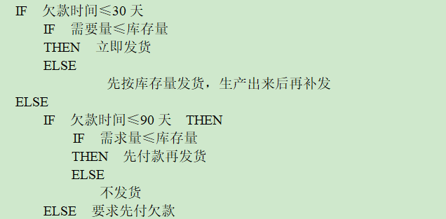 3、某彩电生产企业根据销售商欠款时间长短和现有库存量情况处理彩电供货方案的结构化语言可表示为:
