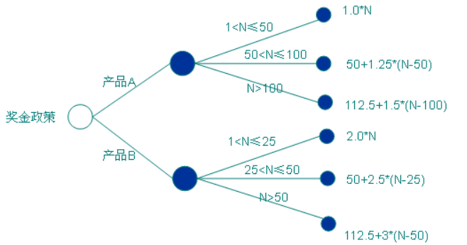 4.某工厂生产两种产品A和B,凡工人每月的实际生产量超过计划指标者均有奖励。对工人超产奖励政策为:对于产品A的生产者:超产数N小于或等于50件时,每超产一件奖励1元;超产数N大于50件、小于100件时,大于50的部分每件奖励1.25元,其余每件奖励1元;超产数大于100件时,超过100的部分每件奖励1.5元,其余按超产100件以内的方案处理。对于B产品的生产者,超产数N小于25件时,每超产一件奖励2元,N大于25、小于或等于50件时,超过25件的部分每件奖励2.5元,其余按超产25件以内处理;N大于50件者,超过50件部分每件奖励3元,其余按超产50件以内处理。根据描述绘制出判定树。